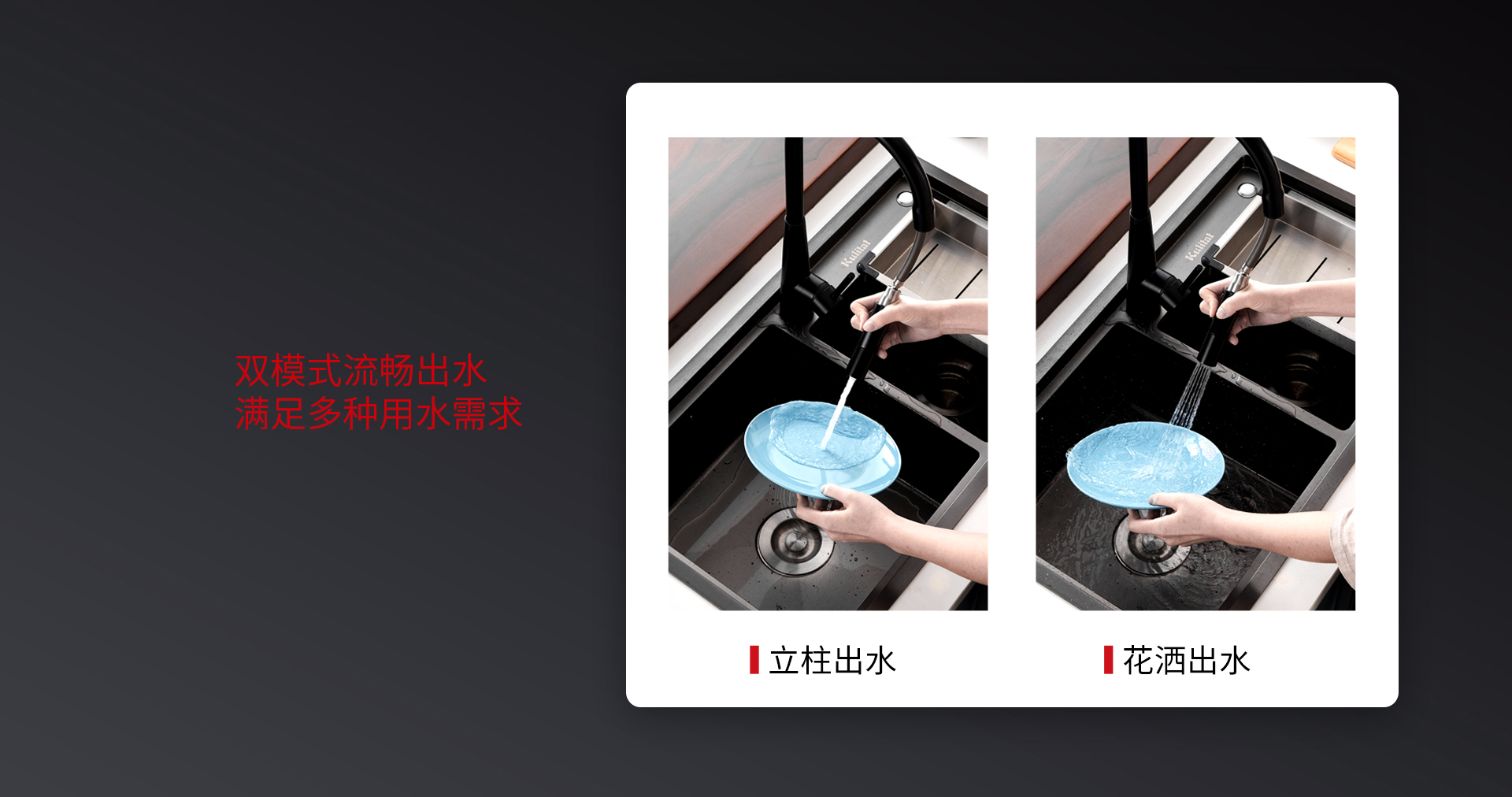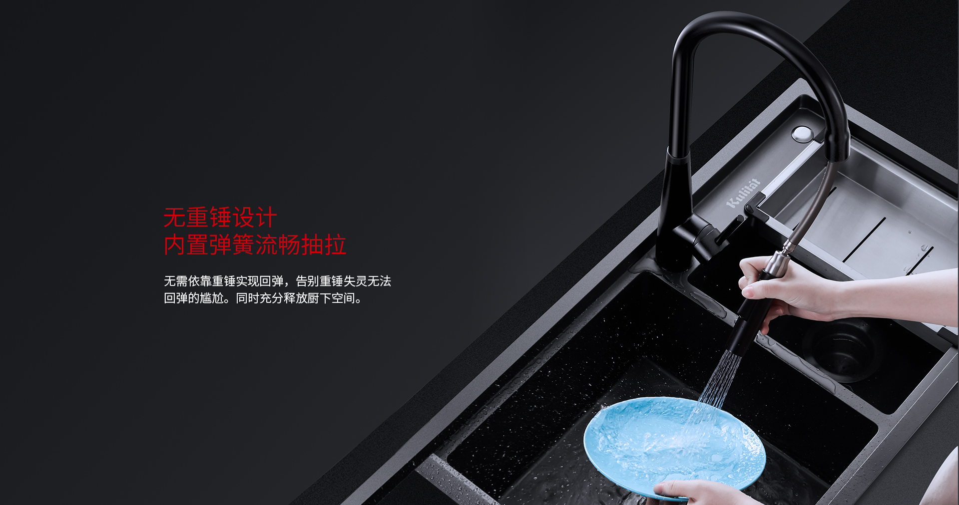 庫靈圖的抽拉式快裝龍頭,打破傳統費時費力的安裝方式,僅需1分鐘即可安裝完成。更亮眼的是其無重錘抽拉結構,流暢抽拉的同時,無需擔心重錘失靈的情況,廚下空間也可以更好地利用。